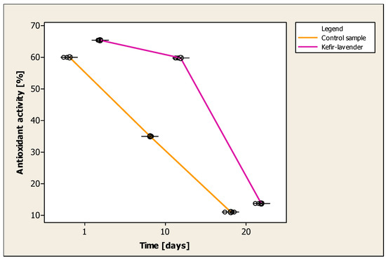Comparative variation of antioxidant activity in kefir sample enriched with encapsulated lavender volatile oil and control sample.