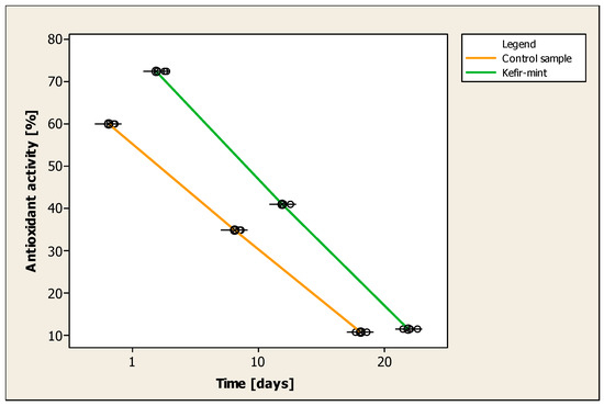 Comparative variation of antioxidant activity in kefir sample enriched with encapsulated mint volatile oil and control sample.