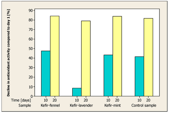 The decline in antioxidant activity on day 10 and day 20 of storage compared to day 1 of storage for kefir samples.