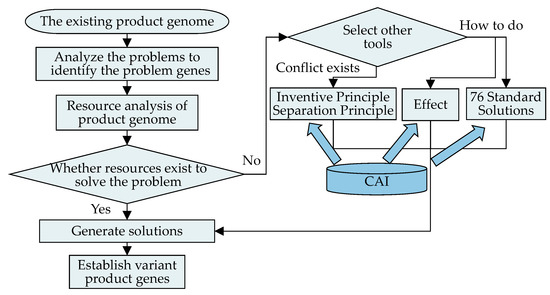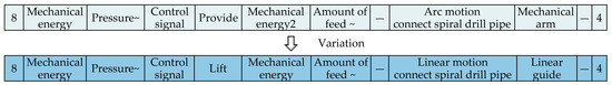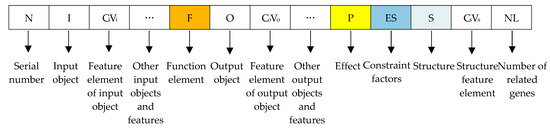 - Variation. Variation is used to improve the existing product genome based on the design requirements. The elements in the product genes are changed through variation. The operation process involves changing the internal elements of gene PGi to produce gene PGi′ based on problem analysis and solution, and then reforming the product genome GP′ = { PG1, PG2, ⋯, PGi′⋯, PGn}.