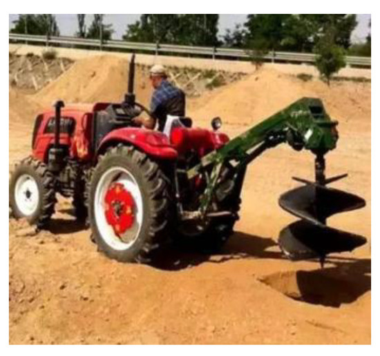 | Location: woodland Weather: sunny Activity: planting trees | Tree planter | Function | Dig pit | Dig tree pit | Workers operate tree planter to dig tree pits |