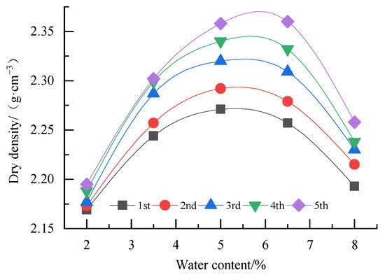 - After five repeated compactions, graded crushed stone maintained reasonable compaction characteristics and the compaction curve was convex. At a constant repeated compaction time, the dry density of graded crushed stone increases first then starts to drop as water content continues to increase. As the repeated compaction times increased, both the maximum dry density and the optimized water content increased, and the average increments after each repeated compaction were 0.024 g·cm−3 and 0.14%, respectively.