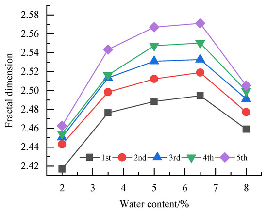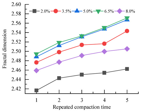 - At a constant water content, the fractal dimension of particle size distribution increased with the increase in the repeated compaction time. When the water content of the graded crushed stone is close to the optimal water content, the linear relationship between the fractal dimension and repeated compaction time is more stable. At a constant repeated compaction time, the fractal dimension of the particle size distribution of graded crushed stone increased and then decreased as the water content increased. Water content and repeated compaction times are important factors affecting the fractal dimension of graded crushed stone.