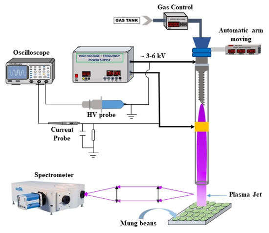 Although enhancing seed germination by cold plasma has been investigated in various plant species with different plasma configurations (dielectric barrier discharge—DBD, gliding arc, plasma jet) and a wide range of treatment protocols [10,17], the optimal parameters for enhancement effect have not been well established. Moreover, there is a lack of study on the phytochemistry pathway of how cold plasma treatment can enhance seed germination and growth of mung beans (Vigna radiata).