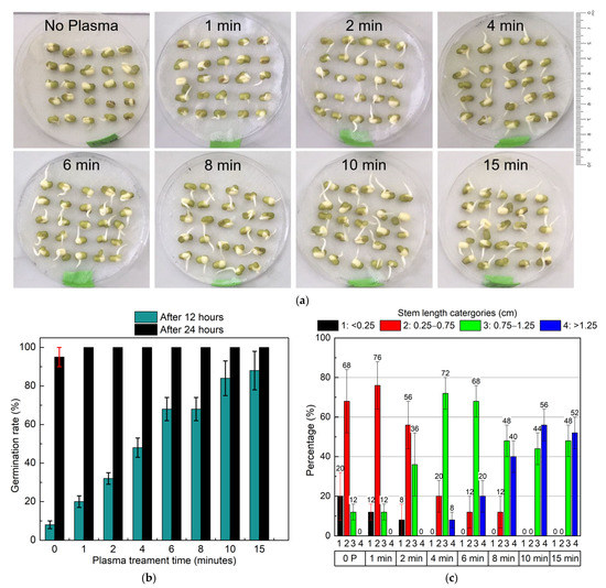 Seed germination is a physiological process that begins with the seeds’ water absorption (imbibition) and ends with the root emerging. To study the effect of the plasma energy dosage on seed germination, we applied different plasma treatment times (1, 2, 4, 6, 8, 10, and 15 min) and monitored both the germination rate and the lengths of the sprout roots after germination. Seed germination and root length were significantly enhanced after plasma treatment (Figure 2a). After 12 h of sowing on cotton under the same conditions, the germination rate, defined as the number of germinated seeds per the total number of seeds (Equation (1)), increased from 8% to 88% (11 times) between untreated and 15-min plasma-treated seeds (Figure 2b). After 24 h, all seeds were germinated, and the length of the root also significantly increased, from 70% in the range of 0.25–0.75 cm (group 2-red) for untreated seeds, to 70% in the range of 0.75–1.25 cm (group 3-green) for 4-min plasma-treated seeds, and up to 60% in the range of longer than 1.25 cm (group 4-blue) for 10-min plasma-treated seeds (Figure 2c). These results were obtained from five replications (a total of 125 seeds per a certain treatment time). Effect of plasma enhancement on the length of 24-h sprout root was saturated after 10 min of treatment, since 10-min and 15-min plasma treatments showed similar results. Our observation also agreed with a recent report [20], which indicated that short-time plasma treatment promoted seed germination and seedling growth, while long-time plasma treatment could have inhibitory effects. For the highest germination rate after 12 h and the longest extrusion root after 24 h, a plasma treatment time of 10 min for 25 seeds with a plasma power of 1.2 W was optimal, which equaled a plasma energy dosage of 0.08 Wh per seed.