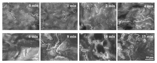 SEM images of the morphology of the seeds’ surface without plasma treatment (0 min) and with 1, 2, 4, 6, 8, 10, and 15 min of plasma treatment.