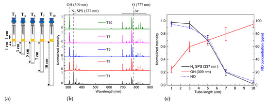 (a) Different downstream tube lengths. (b) Optical emission spectra in 270–900 nm range. (c) Dependence of optical emission intensities from N2 SPS (337 nm), OH radical (309 nm), and NO concentration with different downstream tube lengths.