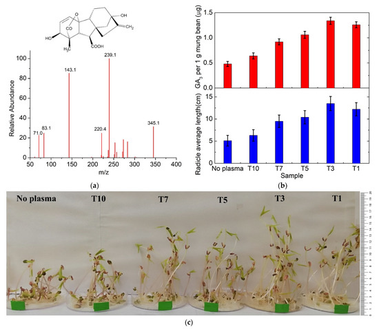 (a) Mass spectrum (MS) and the chemical structure (above) of GA3 from the extracted solution. (b) The amount of GA3 (red, above) extracted per 1 g mung bean; the average length of the radicles (blue, below), and (c) a photo of the radicles after 96 h under no plasma and plasma treatment with different downstream tube lengths. The ruler on the right is 20-cm long.