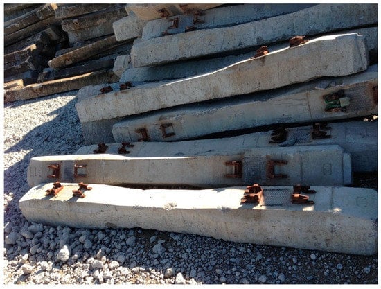At present, ballasted railway tracks are still the dominant type of trackforms globally, which have been employed as a modern type of railway system for urban, suburban, metro, and freight rail networks. The track structure consists of various key components that guide and facilitate the safe, cost-effective, and smooth ride of trains. Railway sleepers are a critical part of the ballasted railway track system. The vertical load from the train wheels will be redistributed to rail pads, sleepers, ballast layer, and formation. The sleepers also play a key role in enhancing lateral track stability and maintaining the rail gauge. From the advent of the railway to the present, the vast majority of materials for railway sleepers are wood, concrete, and steel. In 1943, the first prestressed concrete sleepers were put into use, which demonstrates the advantages of large longitudinal, transverse resistance, and long service life [1]. An example of concrete sleepers reaching their end of life can be shown in Figure 1. Note that prestressed concrete sleepers are the most common type of railway sleepers in use globally [2]. It is estimated that as of 2013, the global investment in railway infrastructures accounted for a third of the total investment in the railway market, about USD 70 billion [3]. The design and manufacture of concrete sleepers has become one of the most critical and fundamental processes for enabling railway infrastructure construction work. In Europe, limit state design standards (on the basis of a performance-based design concept) can be referred to for railway concrete sleepers design such as BS EN 13230-2 [4] and UIC 713: 1ED 2004 [5]. For the design procedure, service life should be carefully considered because it can affect the performance requirements significantly. The other operational criteria that are critical to the design include static and dynamic vertical wheel loads, axle loads, load redistribution between sleepers, lateral loads, longitudinal loads, rail seat loads, and bending moments.