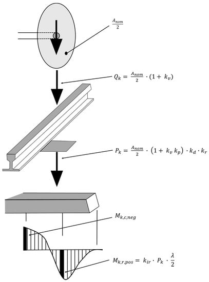Over the past decades, there have been many research investigations with respect to prestressed concrete sleepers. However, only several investigations pay special attention to the design, reliability, and safety factors that correlate the field condition to the design approaches. In Europe, EN13230 “Railway application-Track-Concrete sleepers and bearers” [4], which has been published by the European Committee for Standardization (CEN), indicates design requirements for railway concrete sleepers at rail seat sections and the centre (or midspan) section. The design procedures include the calculation of dynamic rail seat loads, calculation of bending moments, check of resultant stresses, static test verifications, and so on. The concept is similar to other standards such as UIC 713: 1ED 2004 [5], AS1085.14, AREMA Chapter 30, and JSA—JIS E 1201 [9,10]; however, the design methodology in Europe is based on the limit state design principle. First, the quasi-static loads that apply to sleepers have to be calculated based on the axle loads and speeds of the rolling stock. The serviceability limit state of the track is also an important parameter. Then, concrete sleepers are designed to ensure that they can safely bear the loads over their entire service life.