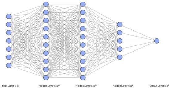 Deep learning is a machine learning concept based on artificial neural networks. For many applications, deep learning models outperform basic machine learning models and traditional data analysis methods [32]. The structure is deeper, containing a multi-layer perceptron with multiple hidden layers. Deep learning forms more abstract attribute categories of high-level representation or features by combining low-level features to discover distributed feature representation of data. The network architecture of deep learning used in the study is shown in Figure 3.