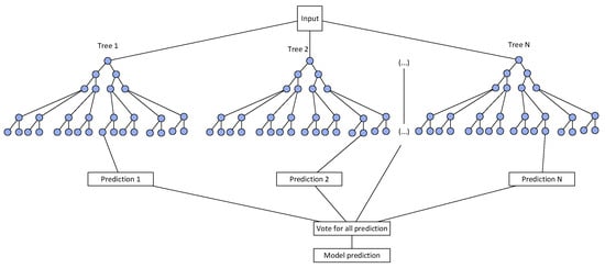 Random forest is a regression technique that combines the performance of many decision tree algorithms to predict the values of variables [35]. Random forest is not sensitive to multicollinearity, so the missing data and unbalanced data have little adverse impact on the prediction results, and up to thousands of feature variables can be used for accurate prediction [36]. This feature is attractive to design application when some design data is missing (or need to be guessed). The architecture of the random forest is shown in Figure 5.