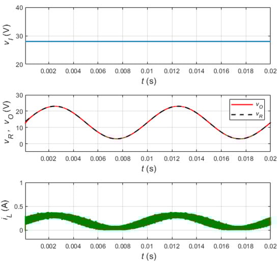 MATLAB simulation result in Figure 4 shows the steady-state waveforms of the input voltage, vI, output voltage, vO, reference voltage, vR, and inductor current, iL. The ramp voltage, VT, switching frequency, fs, input voltage, VI, and load resistance, R, of the electrical model of the closed-loop power converter are set to 4 V, 1 MHz, 28 V, and 75 Ω, respectively. It can be noticed that the closed-loop power converter converts 28 VDC input voltage to (3–23) VAC sinusoidal output voltage at 100 Hz. In addition, the operation of the power converter is maintained in continuous conduction mode, as shown in the inductor current waveform. The simulation result also shows the accurate tracking performance of the proposed control circuit.