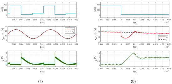 The output voltage response of the closed-loop power converter during abrupt changes in load resistance is depicted in Figure 5. As shown in Figure 5a, the load profile changes abruptly from 75 Ω to 350 Ω, 20 Ω, and then returns to 75 Ω. It can be seen that the output voltage, vO, tracks the reference signal, vR, accurately and rejects the load disturbances. Figure 5b shows an enlarged view of the closed-loop power converter response when the load changes from 350 Ω to 20 Ω at t = 4 ms. The output voltage, vO, exhibits a percentage undershoot of 5.8% and then returns to the reference trajectory within 15 μs. Notably, the proposed control circuit exhibits robust tracking performance and fast transient response with a low percentage undershoot.