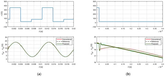 To investigate the tracking performance of the two control methods, the response under load disturbances is depicted in Figure 6a. The enlarged view of the response in Figure 6b shows that the conventional control scheme exhibits a percentage undershoot of 5.1% when the load resistance changes from 350 Ω to 20 Ω at t = 4 ms. However, the output voltage, vO, converges to the reference voltage within 100 μs, and a steady-state error of 1.5% is generated under such load disturbance. It can be noticed that the transient response and the tracking capability of the conventional DI-SMC scheme are degraded.