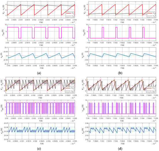 The ramp voltage, control voltage, gate-to-source voltage, and output voltage of the (a,b) proposed and (c,d) conventional control schemes.