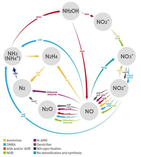 ANAMMOX, anaerobic ammonium (NH4+) oxidation; AOA, ammonia (NH3)-oxidizing archaea; AOB, NH3-oxidizing bacteria; DNRA, dissimilatory nitrite (NO2–) reduction to NH4+; amo, ammonia monooxygenase; norB, nitric oxide reductase; hao, hydroxylamine oxidoreductase; hdh, hydrazine dehydrogenase; hzo, hydrazine oxidase; hzs, hydrazine synthase complex; hmp, flavohemoglobin; narG, nitrate (NO3–) reductase; napA, periplasmic NO3– reductase; nifH, N fixation and nitrogenase; nirB, NO2– reductase large subunit; nirK, NO2– reductase K; nirS, NO2– reductase S; nosZ, nitrous oxide reductase; nrf, NO2– reductase; nxr, NO2– oxidoreductase.