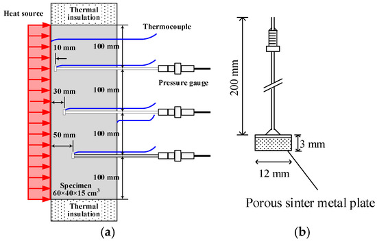 To measure the temperature at different depths, K-type thermocouples (the highest measuring temperature can reach 1000 °C) were embedded in the slab specimen, and they were placed at depths of 0, 10, 30, 50, and 150 mm from the heated surface. In addition, at the center point, 100 mm above the center point, and 100 mm below the center point of the slab specimen to be poured, the depths were 10, 30, and 50 mm from the heated surface (as shown in Figure 3a). A thin steel tube with a diameter of 1.6 mm and a length of 200 mm was used. Referring to the pore pressure measurement method of Bangi and Horiguchi [46], a copper ring (12 mm in inner diameter and 3 mm in length) was welded to the edge of the end of these thin steel tubes, and the copper ring was filled with a porous sinter metal plate (as shown in Figure 3b). The plate could prevent the cement matrix from flowing back to the thin steel pipe when pouring the specimen so that the pore pressure at these positions could be measured correctly.
