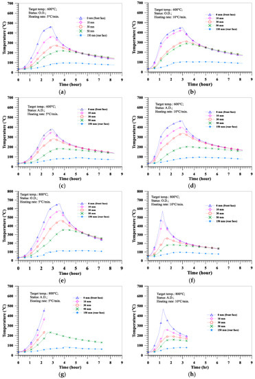 Temperature distribution curves of the heated LWAC slabs: (a) L-OD-600-R5; (b) L-OD-600-R10; (c) L-AD-600-R5; (d) L-AD-600-R10; (e) L-OD-800-R5; (f) L-OD-800-R10; (g) L-AD-800-R5; (h) L-AD-800-R10.