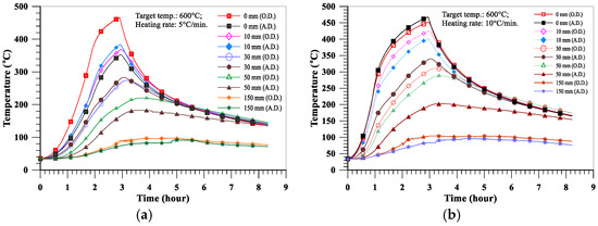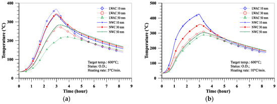 Comparison of the temperature distributions of the LWAC specimens at a target temperature of 600 °C: (a) heating rate of 5 °C/min; (b) heating rate of 10 °C/min.