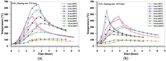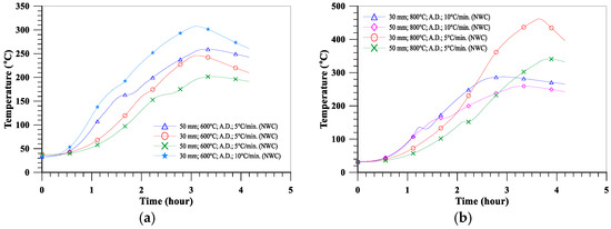 Comparison of the temperature distributions of the air-dried NWC specimens: (a) target temperature of 600 °C; (b) target temperature of 800 °C.