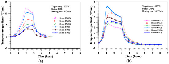 Comparison of the temperature gradients between the LWAC and NWC oven-dried specimens at a target temperature of 600 °C: (a) heating rate of 5 °C/min; (b) heating rate of 10 °C/min.