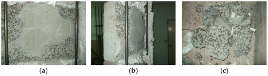 In Table 6, according to the different test variables (i.e., the type of concrete, specimen’s moisture state, target temperature, and heating rate), the spalling of the specimen or lack thereof during the high-temperature test is indicated. The table shows that the specimens with corner spalling in the test were all LWAC, and the target temperature was 800 °C. Figure 6f–h show that the thermal gradient of the heated surface of these specimens was large. This is because LWAC has a low thermal conductivity and a strong heat resistance effect, which caused a large temperature difference between the inside and outside of the specimen, resulting in a difference in the thermal expansion. This caused the concrete to peel off due to the tension, as shown in Figure 12. Corner spalling is a nonviolent form of spalling characterized by the separation of the concrete corners. It usually occurs late in the high-temperature test, mainly due to the loss of tensile strength due to the prolonged exposure to high temperatures [54].