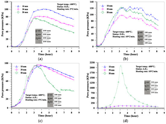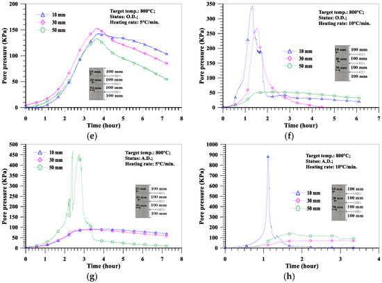 On the other hand, Figure 13 shows that the relationship between pore pressure and time basically consisted of an ascending branch followed by a descending branch, and the ascending and descending rates varied with the location of the measuring point. The ascending branch could be explained as a result of the formation of a fully saturated layer during the transport of moisture to the deeper, cooler regions of the heated concrete, which prevented further transport of moisture vapor, resulting in a build-up of pore pressure at the saturated front [60]. Due to the formation of the moisture clog, the vapor flow would only flow to the heated surface. In addition, the concrete located between the heated surface and the moisture clog continued to dry and dehydrate. Once the rate at which the vapor escaped from the pores was higher than the rate at which the vapor (from drying, dehydration, and transport) filled the pores, the pressure began to drop [48]. At the same time, cracking might also lead to a decrease in pore pressure by creating more usable volume in the matrix, especially by increasing the permeability of the material such that vapor can escape [61]. These two phenomena could explain the shape of the pore pressure curve. In order to further understand the influence of various test variables on the pore pressure distribution of concrete slabs, the following subsections analyze and discuss the test results under different test conditions.