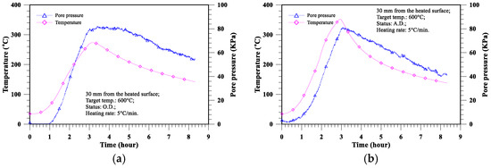 The evolution with time of the temperature and pore pressure at a depth of 30 mm from the heated surface of the LWAC slab at a target temperature of 600 °C and a heating rate of 5 °C/min: (a) oven-dried state; (b) air-dried state.