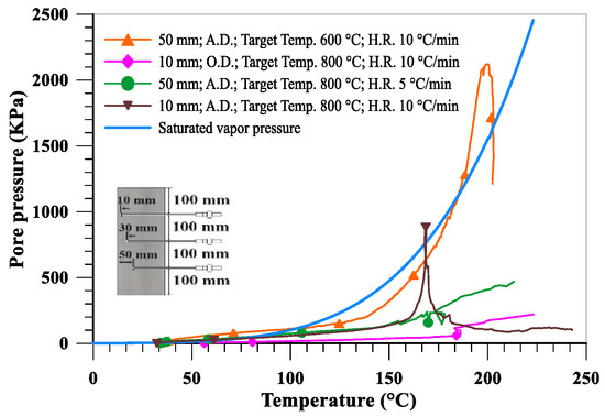 In this study, the temperature at depths of 0, 10, 30, 50, and 150 mm and the pore pressure at depths of 10, 30, and 50 mm from the heated surface of the specimen were measured. The test variables are listed below: