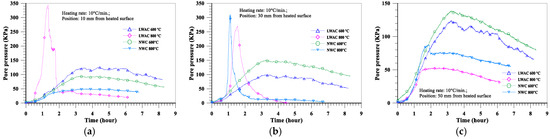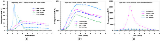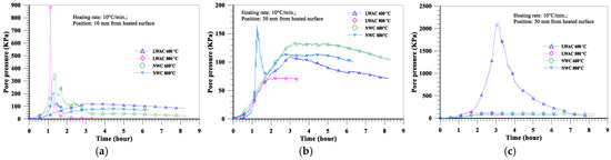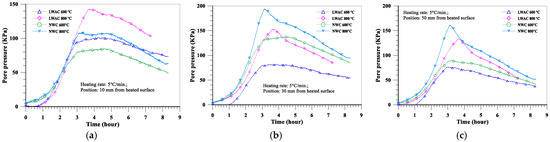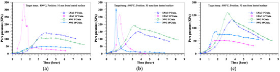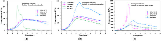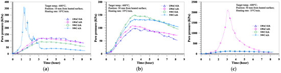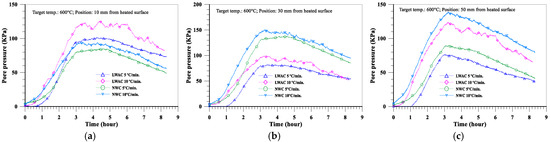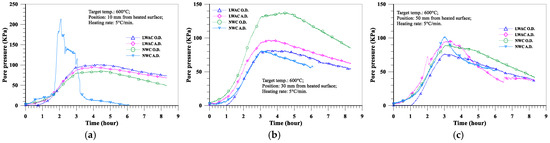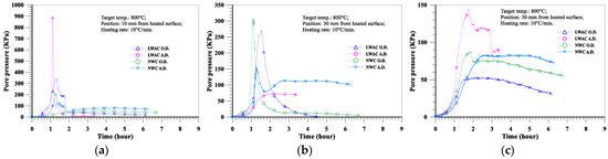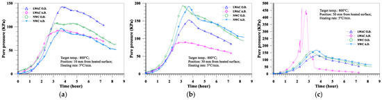The evolution of the pore pressure at a depth of 10 mm from the heated surface of oven-dried specimens at a heating rate of 5 °C/min is shown in Figure 16a. With the increase in the target temperature (from 600 to 800 °C), the maximum pore pressure of the LWAC slab increased significantly from 102 to 143 KPa, while the maximum pore pressure of the NWC slab increased from 85 to 109 KPa. Furthermore, under the same target temperature conditions, the pore pressure of the LWAC slab at a depth of 10 mm was higher than that of the NWC slab. As for the depths of 30 and 50 mm from the heated surface of the concrete slab, the evolution of the pore pressure is shown in Figure 16b,c. With the increase in the target temperature, the pore pressure of the LWAC slab still increased significantly there, as did the NWC slab. For example, when the target temperature was raised from 600 to 800 °C, the maximum pore pressure at a depth of 30 mm for the LWAC slab increased significantly from 82 to 153 KPa, while the maximum pore pressure at a depth of 30 mm for the NWC slab increased from 138 to 194 KPa. From the above results, a higher target temperature could cause the maximum pore pressure to occur further from the heated surface. This is because the water vapor from the depth of the heated surface was less likely to transfer, and the higher target temperature could cause the free water trapped in the matrix to evaporate. Therefore, its pore pressure could be increased. However, under the same target temperature conditions, the pore pressures of the LWAC slab at depths of 30 and 50 mm were lower than those of the NWC slab. This situation is opposite to the aforementioned case with a depth of 10 mm from the heated surface of the specimen, and this may be due to the low thermal conductivity of LWAC. This can be seen in Figure 10; the temperatures of the LWAC slab at depths of 30 and 50 mm were lower than those of the NWC slab; thus, the pore pressure of these measuring points was also relatively low.