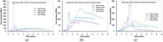 Effect of the moisture content on the pore pressure of the specimens performed at a target temperature of 800 °C and a heating rate of 5 °C/min: (a) 10; (b) 30; (c) 50 mm depths.
