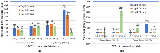 On the other hand, under the conditions of an air-dried state, a target temperature of 600 °C, and a heating rate of 5 °C/min, the Pmax of the LWAC and NWC slabs occurred at 30 and 10 mm from the heated surface, respectively. It is worth noting that the Pmax of the LWAC slabs at three different depths was almost the same, ranging from 96 to 97 kPa. Under the conditions of an air-dried state, a target temperature of 800 °C, and a heating rate of 5 °C/min, the Pmax of the LWAC and NWC slabs occurred at 50 and 30 mm from the heated surface, respectively. Among them, the Pmax of the LWAC slab was 469 kPa, and the Pmax of the NWC slab was 192 kPa. This result shows that a higher target temperature would cause its Pmax to appear further from the heated surface. The design strength of the LWAC and NWC slabs was 40 MPa, but the strength of the LWA was lower than that of the normal-weight aggregate. Therefore, its matrix was bound to have high strength and compactness. In other words, it was relatively less permeable, which might lead to higher pore pressures. Under the conditions of an air-dried state, a target temperature of 600 °C, and a heating rate of 10 °C/min, the Pmax of the LWAC and NWC slabs occurred at 50 and 10 mm from the heated surface, respectively. In addition, under the conditions of an air-dried state, a target temperature of 800 °C, and a heating rate of 10°C/min, the Pmax of both the LWAC and NWC slabs occurred at 10 mm from the heated surface. Among them, the Pmax of the LWAC slab was 2121 kPa, which was significantly higher than that of the NWC slab, which was 363 kPa. This is the same result as the specimen in the air-dried state at a heating rate of 5 °C/min.
