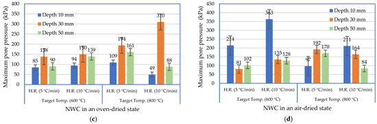 The measured maximum pore pressure under different test conditions: (a) LWAC in an oven-dried state; (b) LWAC in an air-dried state; (c) NWC in an oven-dried state; (d) NWC in an air-dried state.