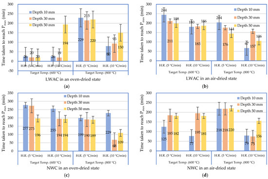 The time at which the maximum pore pressure occurred under different test conditions: (a) LWAC in an oven-dried state; (b) LWAC in an air-dried state; (c) NWC in an oven-dried state; (d) NWC in an air-dried state.