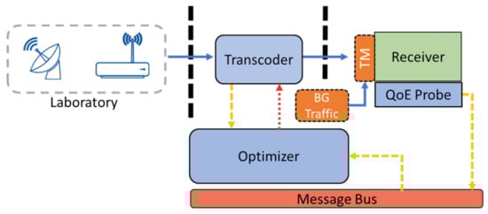 The objective is to perform an optimization of the multimedia service, evaluating the QoE in the receiver, and optimizing the bitrate. The content will be received at the end of the flow, which will feed the optimizer to predict the actions that enable better QoE in the environment. These actions are reflected in the transcoder, which will adapt the bitrate to the actions taken. During training, the receiver is expected to have low-quality video at certain times, including image artifacts such as block loss. By using background traffic, the environment will face cases where the conditions are extremely poor, and in initial phases the optimizer will not know how to properly act (learning from different conditions). More details about this problem are presented in Section 2.4. Once trained, we can assess whether, through training, we have managed to alleviate video problems caused by various conditions in the network, obtaining the best possible QoE.