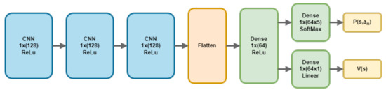Two NNs are included in the agent’s position, one being the Actor, who is responsible for taking the actions evaluating the entire system, and the other NN corresponding to the Critic, which evaluates (criticizes) the actions taken by the Actor (configuration in Table 1). Both NNs share the structure of CNN architecture as input, with fully connected dedicated layers as output per network. In addition, there are some hidden layers with ReLu activation. The input of both neural networks consists of the set of states, as well as the number of states to hold in each training step (states batch).