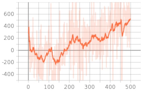 Figure 4 shows how negative values are returned on average in the initial steps, but after training, the average reward function improved by more than 300% from the beginning, indicating that the algorithm optimizes properly following the reward function, which delivers a better score with training.