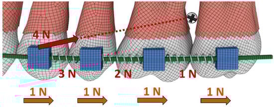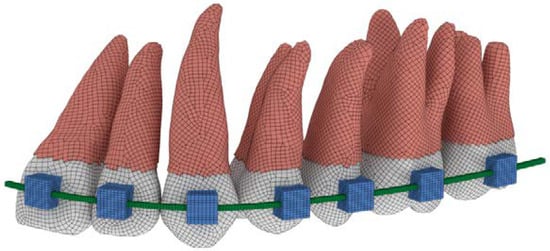 Contact boundary conditions were applied between the teeth and between the archwire and the brackets. The friction coefficient between the archwire and the brackets was determined to be 0.08 according to previous studies [,,], based on the assumption that friction coefficient becomes smaller under the vibration caused by mastication than that under static conditions.