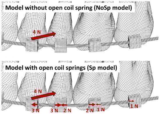 We compared two models, namely, a model without open-coil springs (NoSp model), which represents the conventional grouped distalization technique, and one with open-coil springs (Sp model), which represents our proposed technique. Elastic chains and open-coil springs were represented by external forces (Figure 3). A retraction force of 4 N to simulate an elastic chain was applied to the first premolar. The force was directed towards an anchor screw between the roots of the upper molar and the second molar, and the height of the anchor screw was 5.0 mm from the bracket level. In the Sp model, external forces of 3 N were applied reciprocally to the distal surface of the first premolar’s bracket and the mesial surface of the second premolar’s brackets, simulating an open-coil spring between them. External forces of 2 N were applied between the second premolar’s bracket and the first molar’s bracket, and forces of 1 N were applied between the first molar’s bracket and the second molar’s bracket in the same manner.