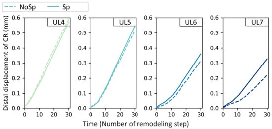 Changes in the distal displacement of the center of resistance (CR) of each tooth over time. More distalization was observed in the Sp model. Line colors indicate tooth type.