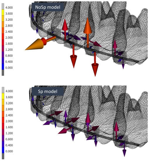 Contact forces between the teeth and between the brackets and the archwire. Higher levels of contact force were observed in the NoSp model.