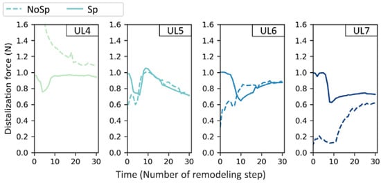 The molars in the NoSp model received less force than those in the Sp model. Figure 6 indicates the change in the transmitted distalization force on each tooth throughout the simulation. As for the NoSp model, the force transmitted to the second molar was 0.2 N, while the first premolar received 2.5 N at the stage of initial displacement within the PDL. The forces transmitted to the molars began to increase at a certain point after the bone remodeling operations, reaching 0.6 N. On the other hand, all premolars and molars in the Sp model received forces of 1 N at the initial displacement. The forces began to decrease at a certain point after the bone remodeling operations, dropping to 0.7 N.
