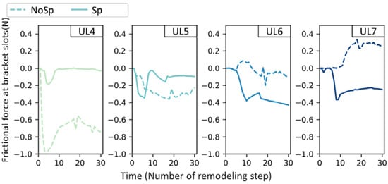 Slight frictional force between the bracket and the archwire was observed in both the NoSp and Sp models at the initial displacement step, and it increased after a certain number of iterations of the bone remodeling operation in the simulation. Figure 7 indicates the changes in the frictional force on each bracket throughout the simulation. Positive values indicate that the frictional force was directed toward the distal direction, while negative values indicate that it was directed toward the mesial direction. For the NoSp model, frictional force that resisted distalization force was observed at the premolars, while frictional force that supported distalization was observed at the second molar. On the other hand, in the Sp model, frictional force that resisted distalization force was observed at both premolars and molars, and higher friction was observed at the molars than at the premolars.