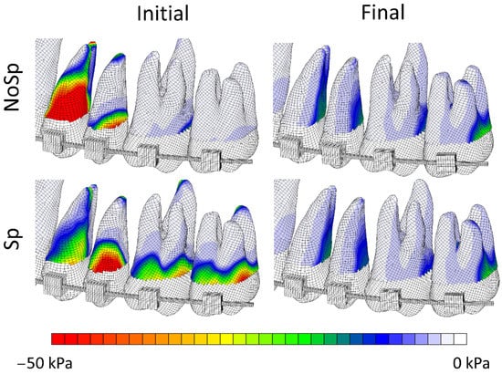 Figure 8 shows the stress distribution over the PDL. The red-colored regions indicate highly compressed regions where the minimum principal stress (i.e., compression stress) was lower than −40 kPa. As for the NoSp model, a large highly compressed region was observed in the PDL of the first premolar, while a smaller region was observed in that of the molars at the initial displacement. The minimum principal stress of the most highly compressed region in the first premolar reached −159.1 kPa. As for the Sp model, a highly compressed region was observed on every tooth—especially on the distobuccal side at the initial displacement. The most highly compressed region was observed in the second premolar, and its minimum principal stress was −82.1 kPa. After a number of iterations of the bone remodeling operation in the simulation, the stress distribution became similar in all teeth. However, the compression level was still slightly higher at the first premolar in the NoSp model than in the Sp model when the simulation was finished.