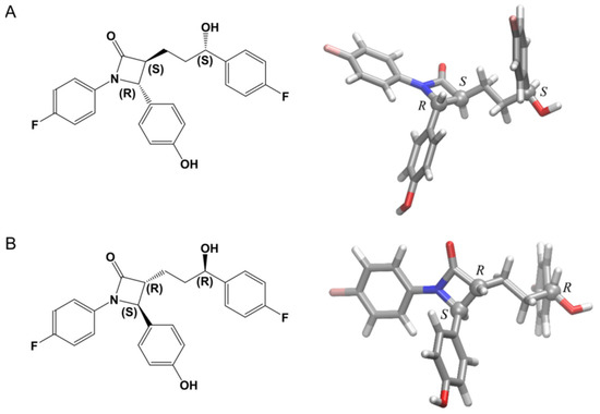 The structure of Ezetimibe enantiomers (A) SRS-EZM, 3(S), 4(R)-1-(4-fluorophenyl)-[3-(4-fluorophenyl)-3(S)-hydroxypropyl]-(4-hydroxypenyl)-2-azetidinone and (B) RSR-EZM. The atoms carbon, hydrogen, oxygen, nitrogen and fluorine are colored silver, white, red, blue, and pink, respectively.