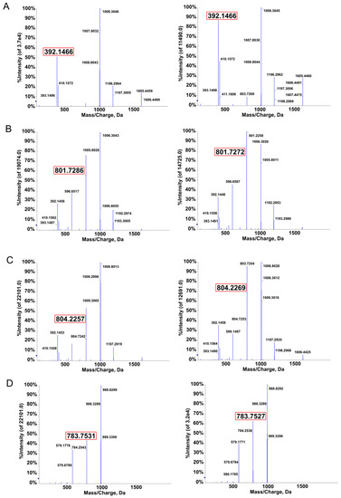 Electronic spray ionization mass spectra were recorded on a LC/MS (amazon ETD Q-Trap) (Bruker 2011) and operated in positive ionization mode, with the spray voltage of −4 kV and auxiliary sheath gas flow speed is 5 L/min. All the samples were continuously infused at 5 µL/min via a 250 µL syringe. Applied voltages were −500 and −4500 V for the ion transfer capillary and the tube lens, respectively. The ion transfer capillary was held at 250 °C. The m/z ranges were set to 300–2000 m/z in profile mode and in the normal mass range during full scan experiments. Spectra were analyzed using the acquisition software XCalibur 2.0.7 (Thermo Scientific, San Jose, CA, USA) without smoothing and background subtraction. During MS/MS scans, collision-induced dissociation (CID) was performed with an activation Q of 0.25 and an activation time of 20 ms occurred in the linear ion trap analyzer (LTQ) and detection in the Orbitrap in centroid mode. The experiments were applied on Agilient Q-ToF 6550 later to ensure its accuracy.