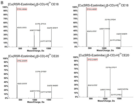 In addition, a ternary complex was detected as [Cu(EZM)2(β-CD)-H]2+ whether in ion trap MS or in Q-TOF MS. After collision in the MS/MS, the [Cu(EZM)2(β-CD)-H]2+ produced several fragments, among which the [EZM-H2O+H]+ (m/z = 392.15) shows a distinct difference between SRS-EZM and RSR-EZM (Figure 3, Table 1). The recognition of SRS-EZM and RSR-EZM was based on the collision-induced dissociation of the diastereomeric complex method.