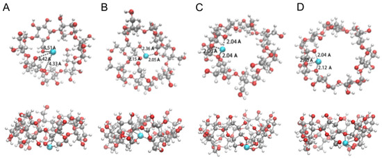 Ball-and-stick model of optimized β-CD/Cu complexes with side and bottom views and its energy. (A): The initial structure when the copper ion is in the center of the small rim of the β-CD; (B): The optimized structure when the copper ion is in the center of the small rim of the β-CD. (C): The initial structure when the copper ion is in the edge of the small rim of the β-CD; (D): The optimized structure when the copper ion is in the edge of the small rim of the β-CD. Color coding: copper, ice blue; carbon, gray; oxygen, light red; hydrogen, white. The bond length (Å) was estimated for three O atoms.