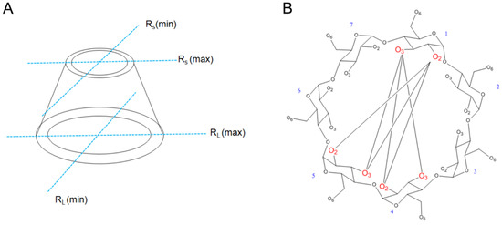 Definitions of parameters for the rim of the β-CD. (A): A scheme showing the skeletal rim parameters. (B): Labels for the O2, O3, and C6 atoms used in the discussion for measuring the skeletal rim parameters. A set of three distances measured for O2 and O3 in glucose 1 and glucose 4, 5 is shown in lines. They are used for measuring RL (max) and RL (min); for the small rim, C6 at opposite groups are measured. RL and RS refer to the value of the large rim and small rim, respectively.